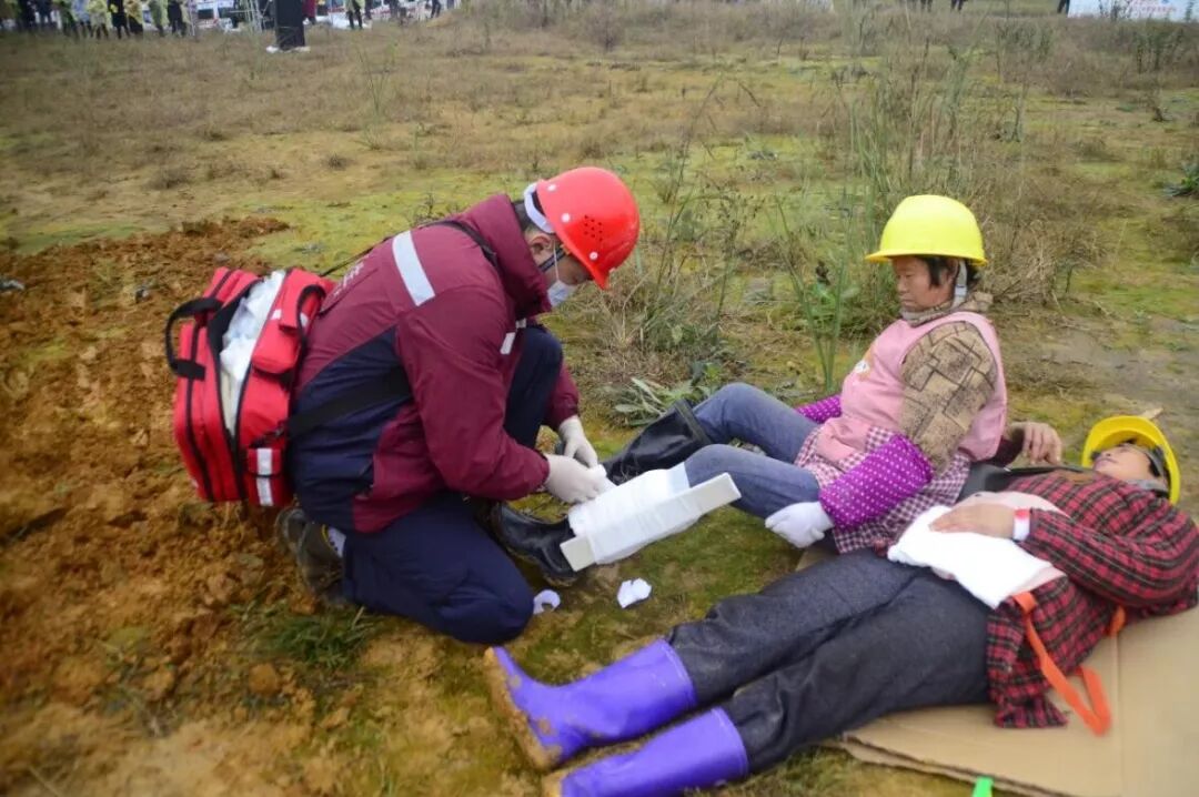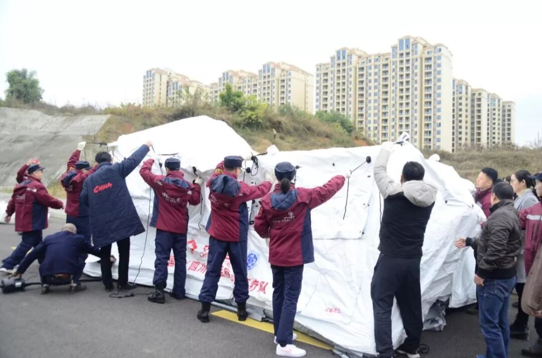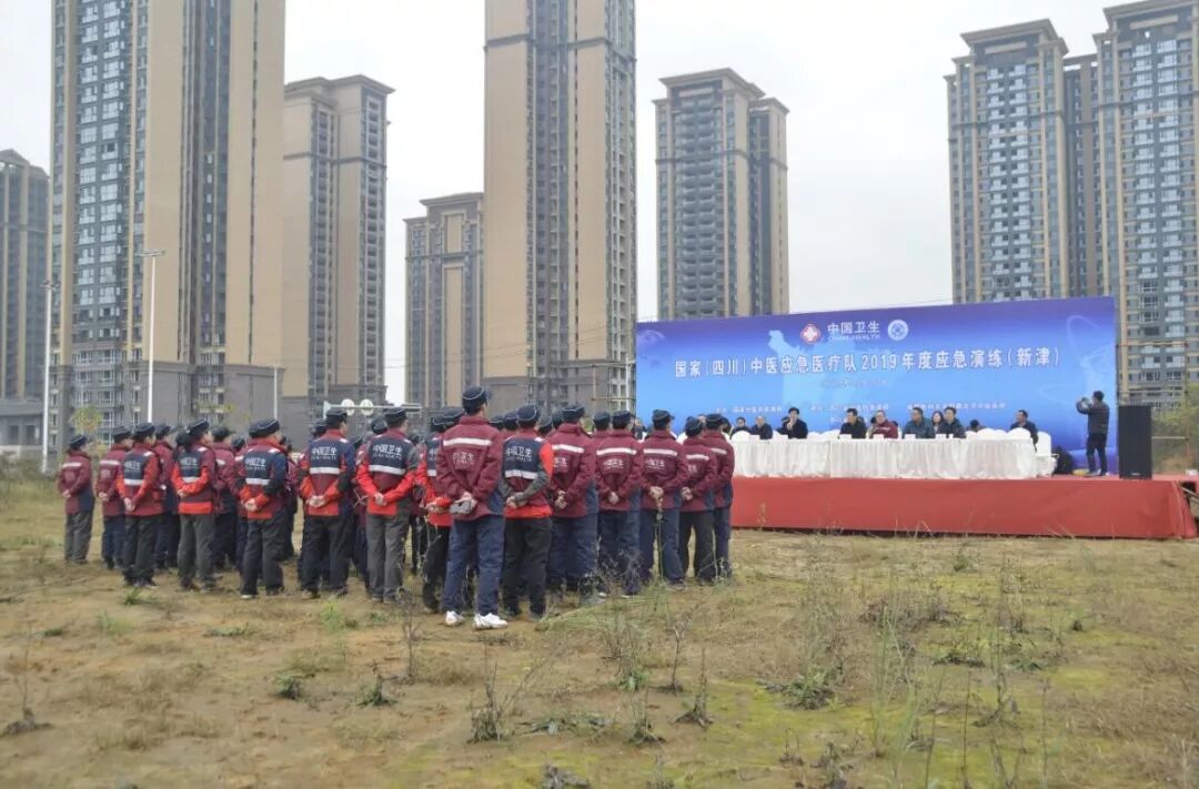 演练背景:2019年11月30日,新津某地发生里氏6.5级地震,受灾区域常住人员2.5万人,据灾区现场报告发现数十人伤亡,国家(四川)中医应急医疗队接到上级卫生行政主管部门指令,开赴新津展开现场医疗救援,国家(四川)中医应急医疗队接到指令后,迅速启动应急预案,30分钟内派出应急小分队,同时集结70人应急医疗队伍,准备应急物资,两小时内出发,迅速开赴灾难现场。