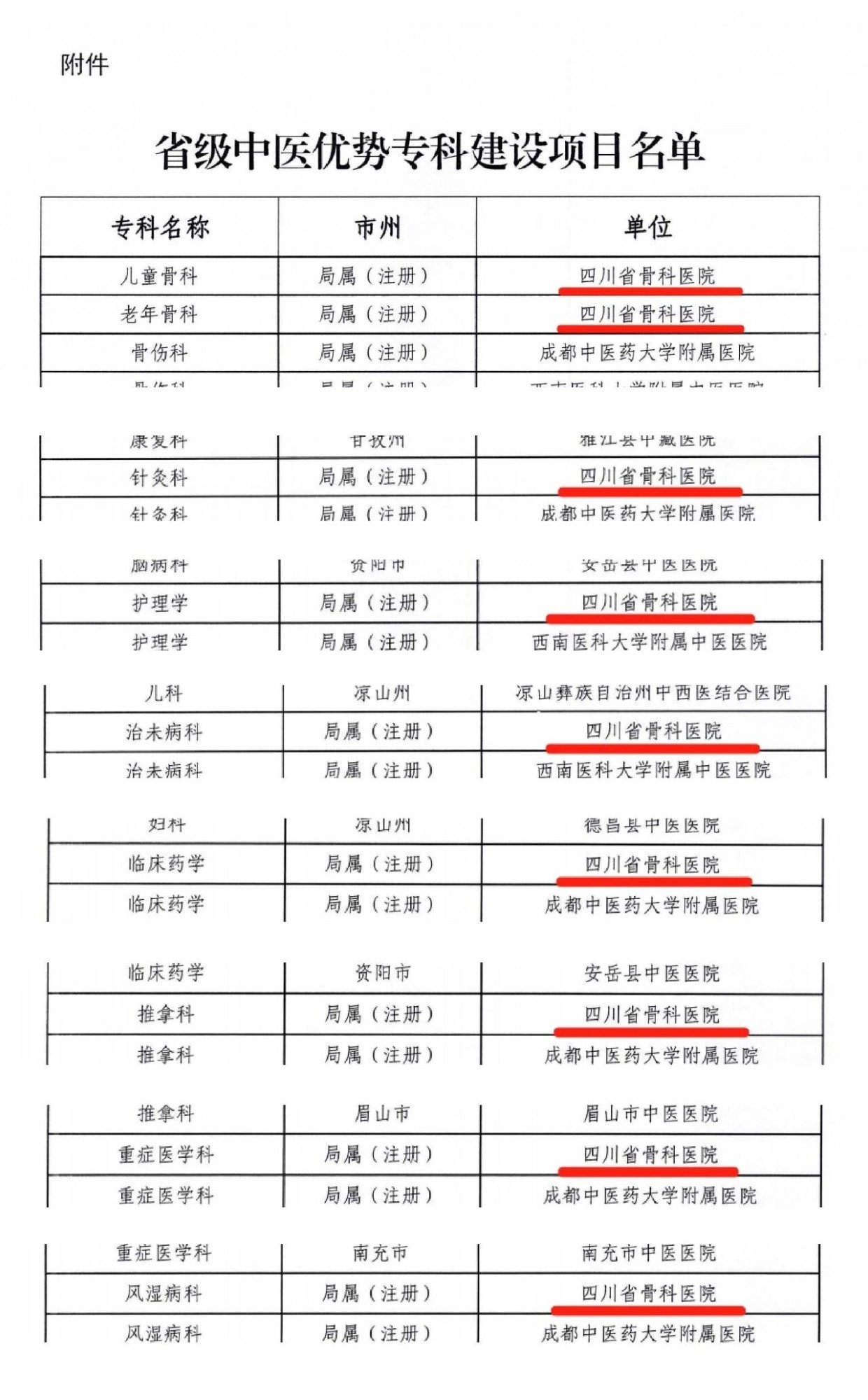 近日,根据《四川省中医药管理局关于公布省级中医优势专科建设项目名单的通知》(川中医药办医政便函〔2026〕1 号)文件精神,四川省骨科医院学科建设再传捷报——儿童骨科、老年骨科、风湿病科、针灸科、推拿科、重症医学科、治未病科、临床药学、护理学共 9 个学科成功入选省级中医优势专科建设项目,标志着医院学科布局持续优化、核心竞争力与特色服务能力再获显著提升。