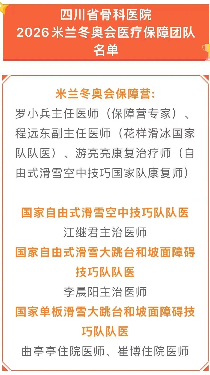 本届米兰冬奥会,四川省骨科医院7名业务骨干专家入选国家队医疗保障团队,采用“随队保障+保障营支持”模式,依托三级医师保障体系,全程护航中国冰雪健儿的赛场征程。