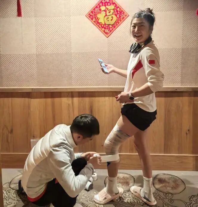 游亮亮康复治疗师为徐梦桃进行肌贴贴扎